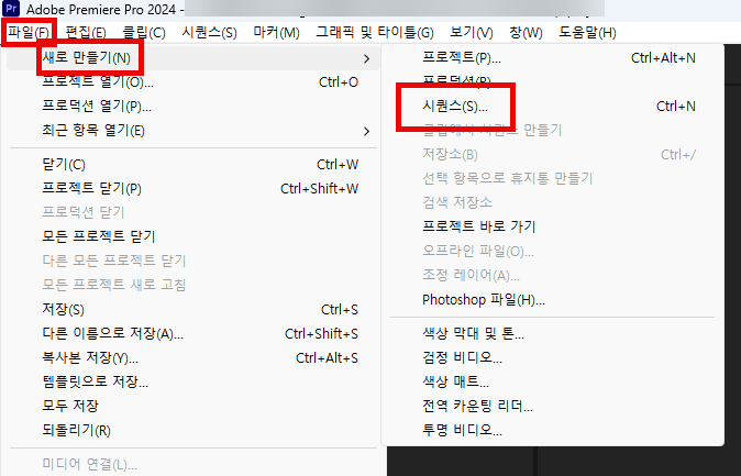 먼저 프리미어 프로를 열어서 파일 > 새로 만들기 > 시퀀스 순서로 들어가 줍니다.
