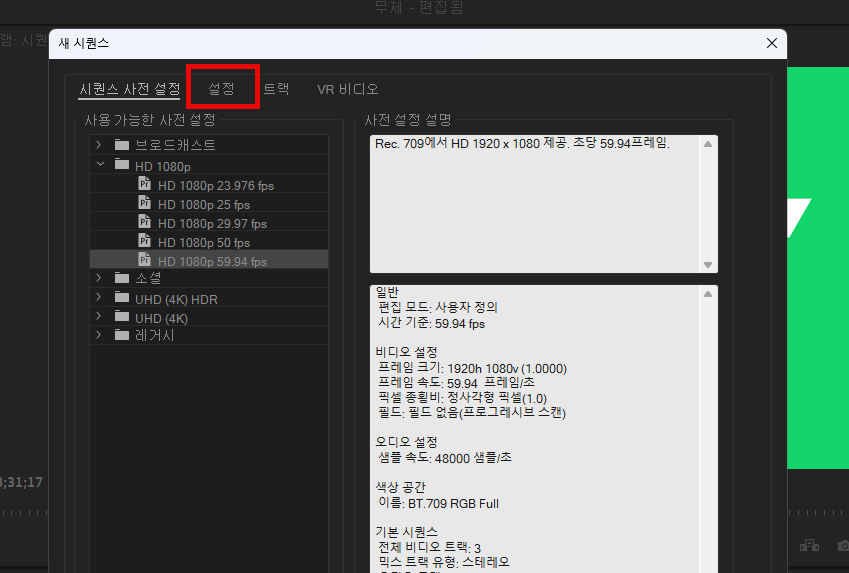 새 시퀀스 만들기로 오셨다면 시퀀스 설정으로 들어가 줍니다.