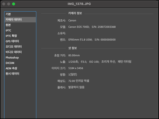 카메라 데이터에서는 어떤 카메라로 찍었는지 또 어떤 렌즈로 찍었는지를 확인하실 수 있습니다. 그리고 이미지의 크기와 노출 등 카메라 설정 값들도 디테일하게 확인하실 수 있습니다. 카메라 정보는 어도비 포토샵에서는 수정이 불가능합니다.